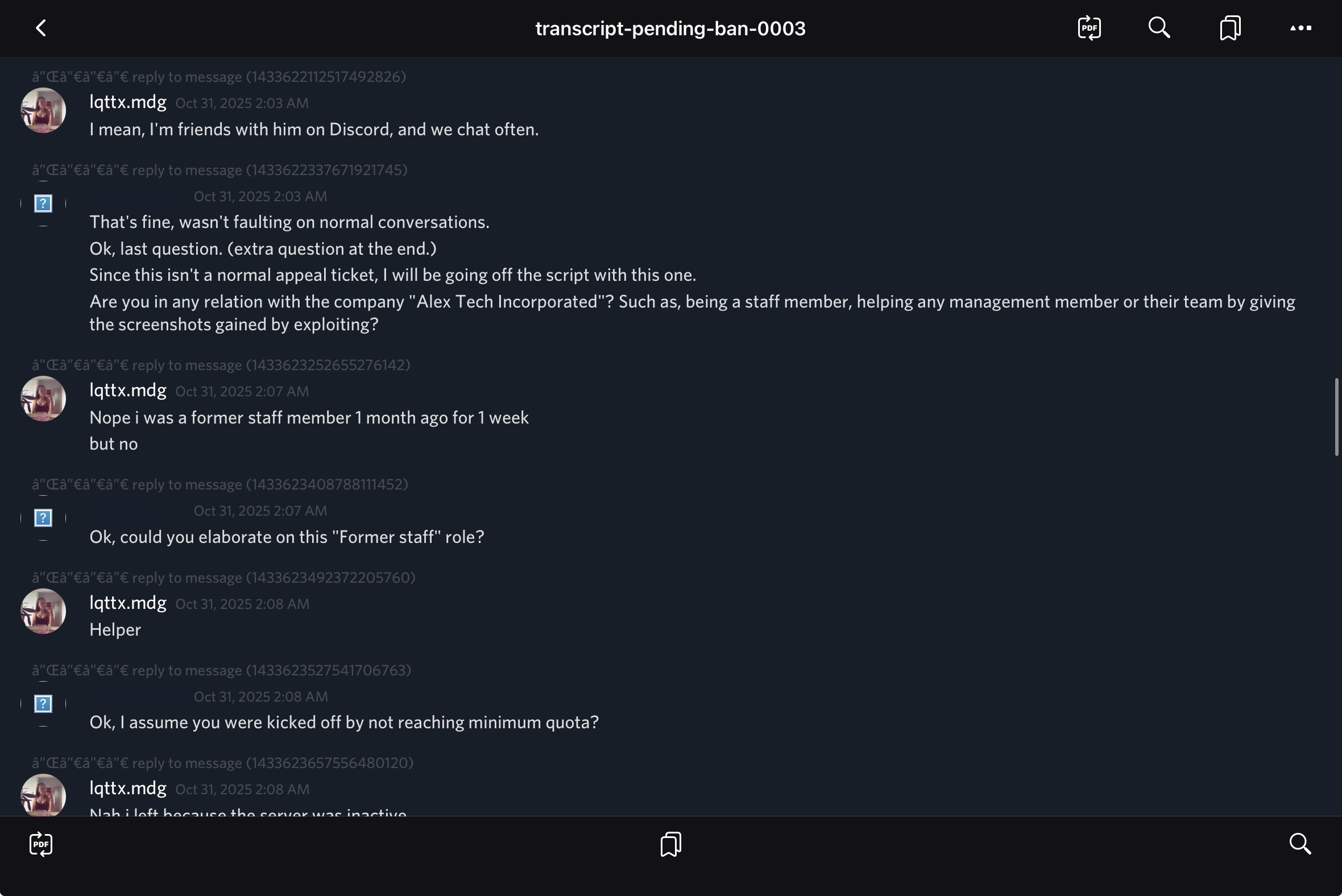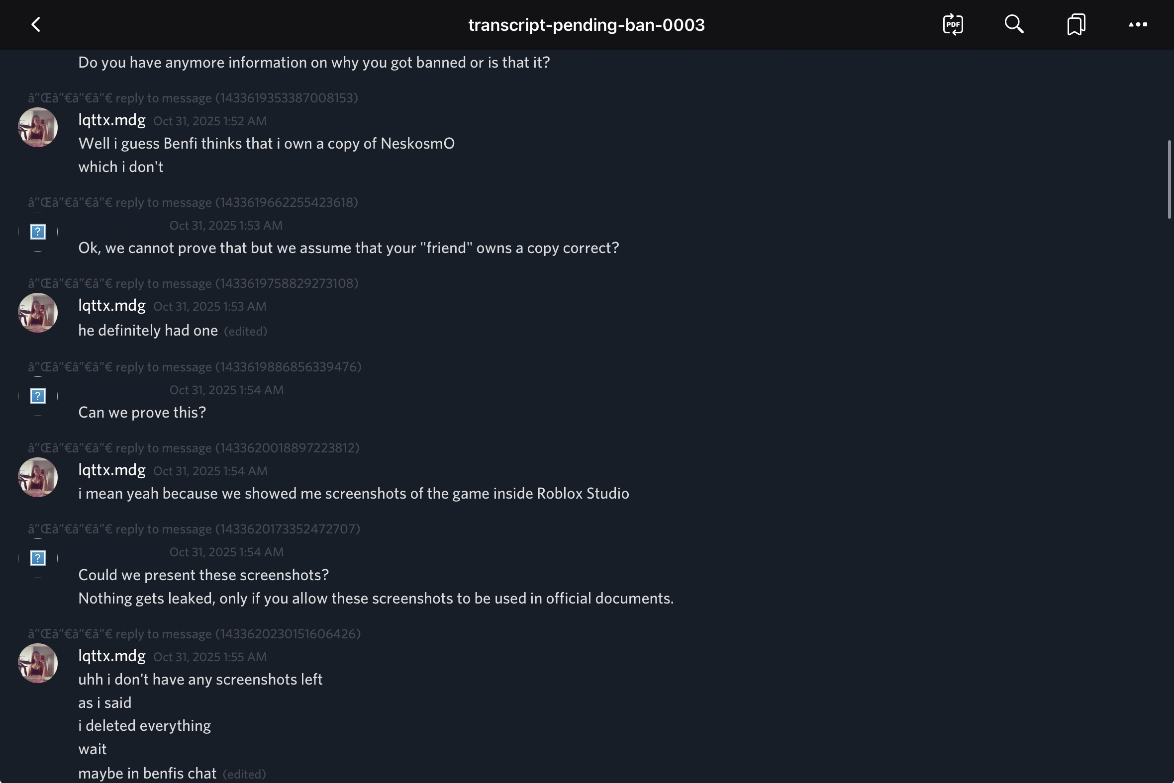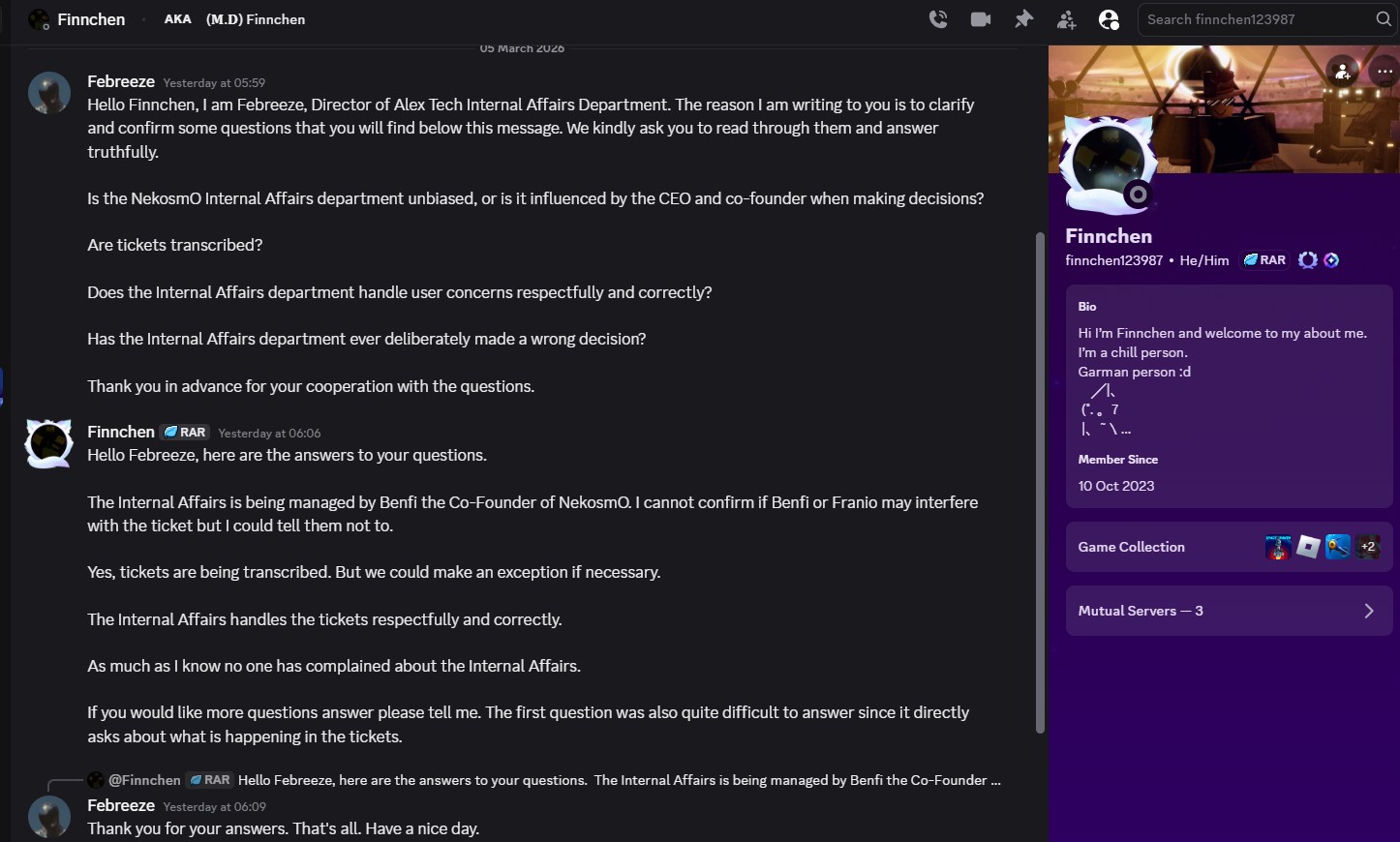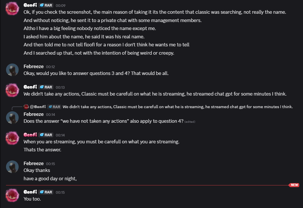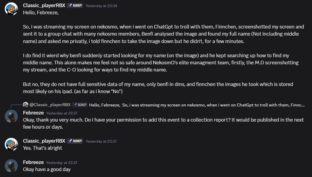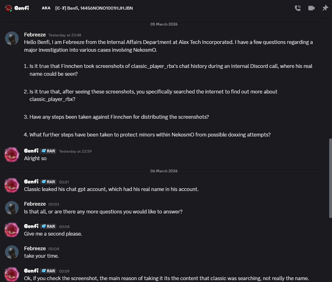 On March 5, 2026, classic_player_rbx (Lead of Administration at NekosmO Studios) contacted Alex Tech. He stated that during a private call he had streamed to NekosmO management, finnchen123987 (Management Director) took screenshots of that stream. These screenshots captured his ChatGPT history and, critically, his real full name.