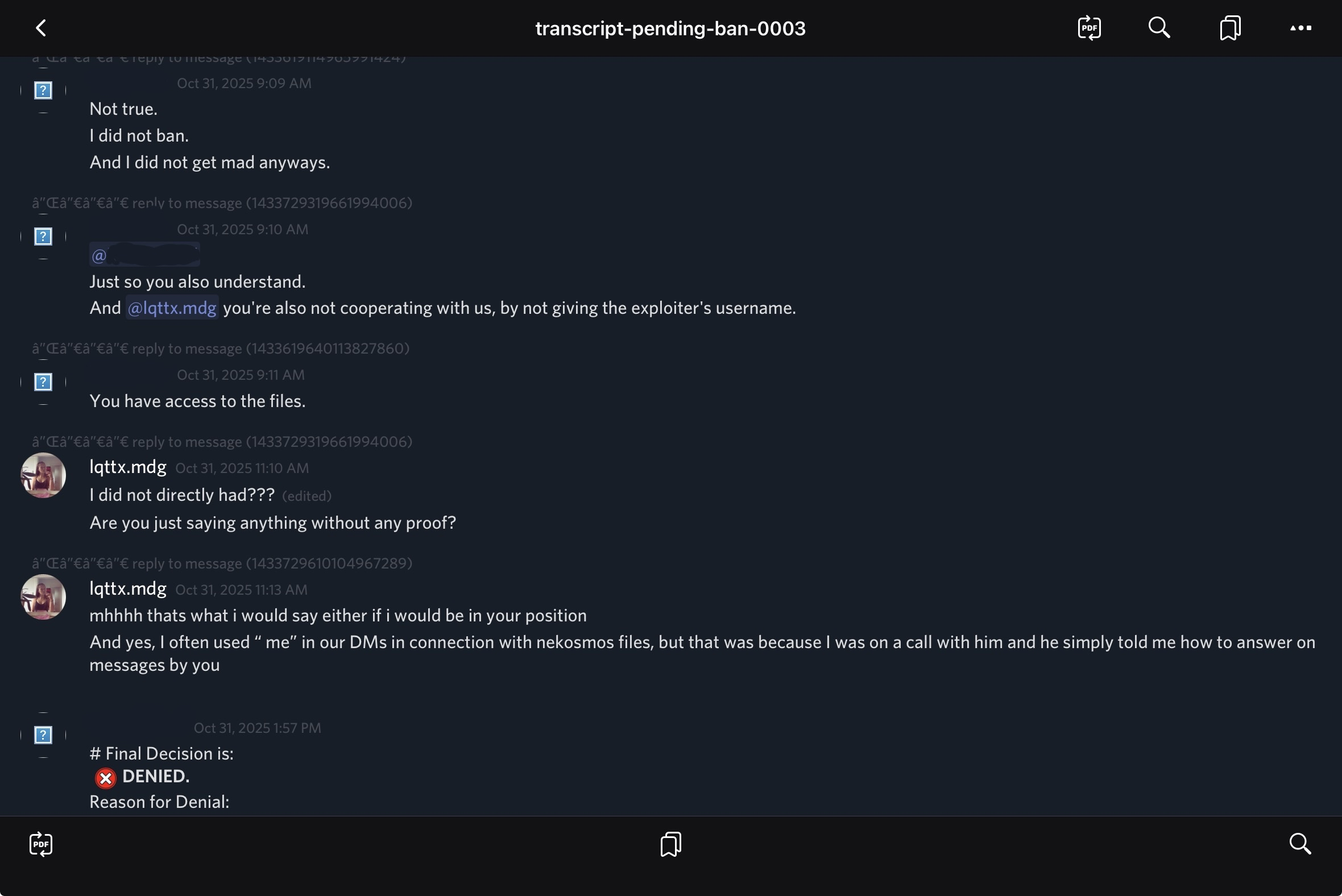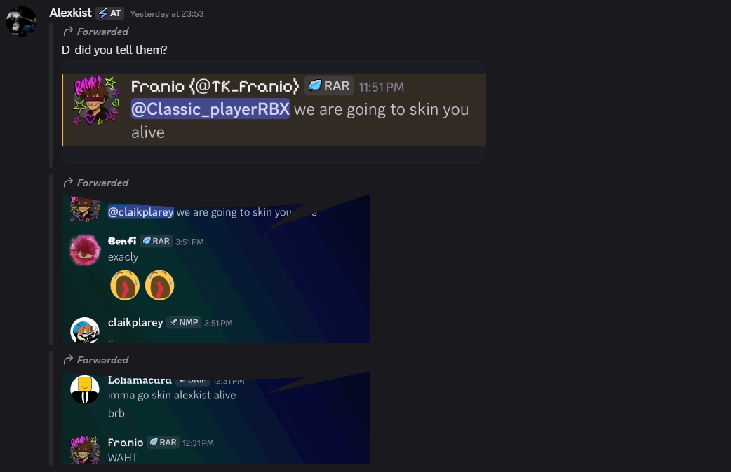 The Internal Affairs Department views this conduct as deeply troubling, particularly given that minors may be active in the NekosmO community. The possibility that personal information could be captured in a screenshot, shared without consent, and go unpunished is unacceptable. Statements threatening to skin someone alive are absolutely reprehensible. We consider this an acute risk of harassment and bullying within NekosmO Studios, and these concerns will be formally communicated to Discord Support.