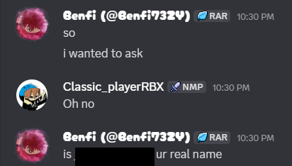 This screenshot was then shared with benfi73zy (Co-Founder of NekosmO Studios), who asked classic_player_rbx whether the name in the screenshot was his real name, and additionally attempted to find more information about him via Google. According to classic_player_rbx, this caused him extreme discomfort and made him feel unsafe in the NekosmO environment.