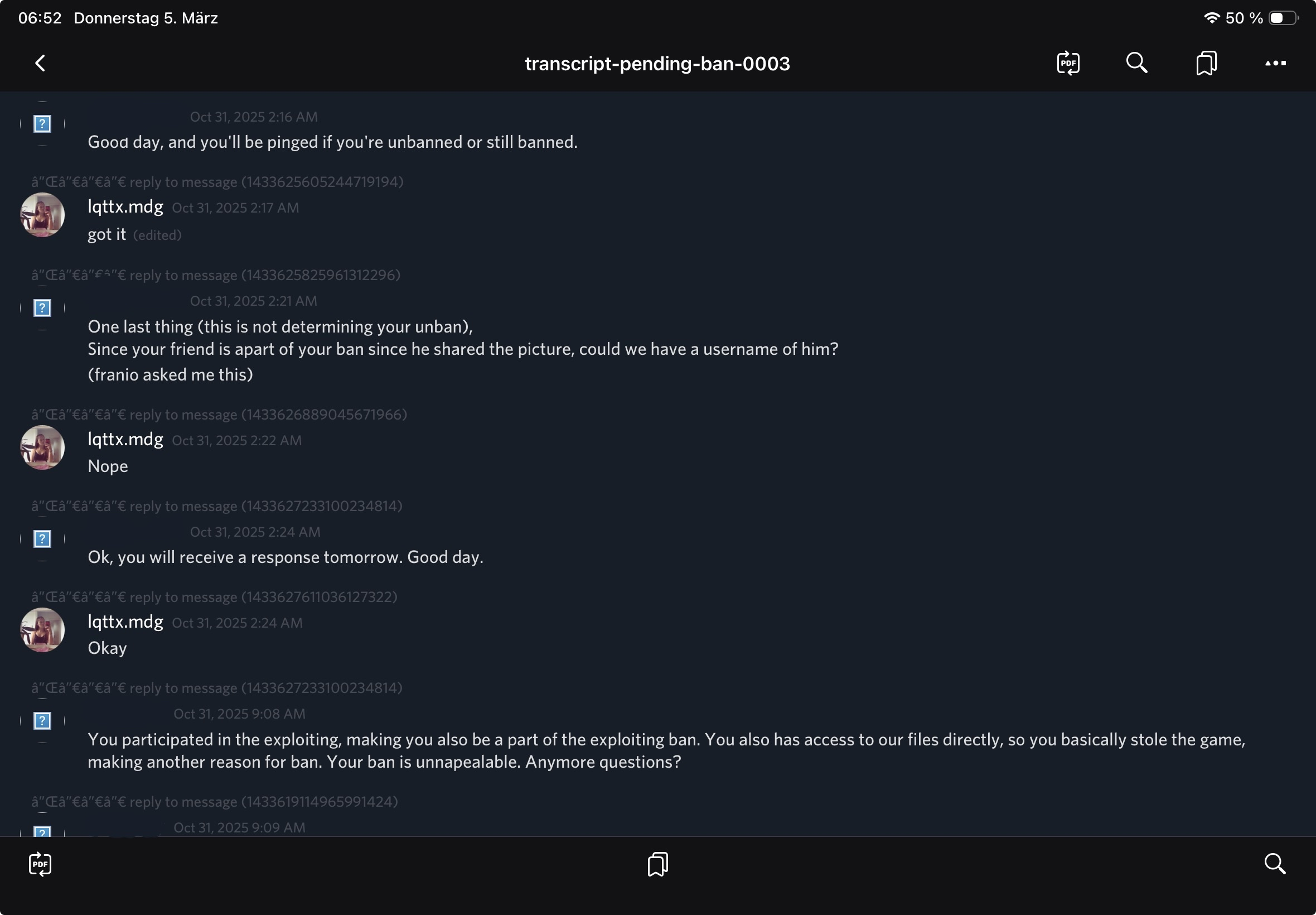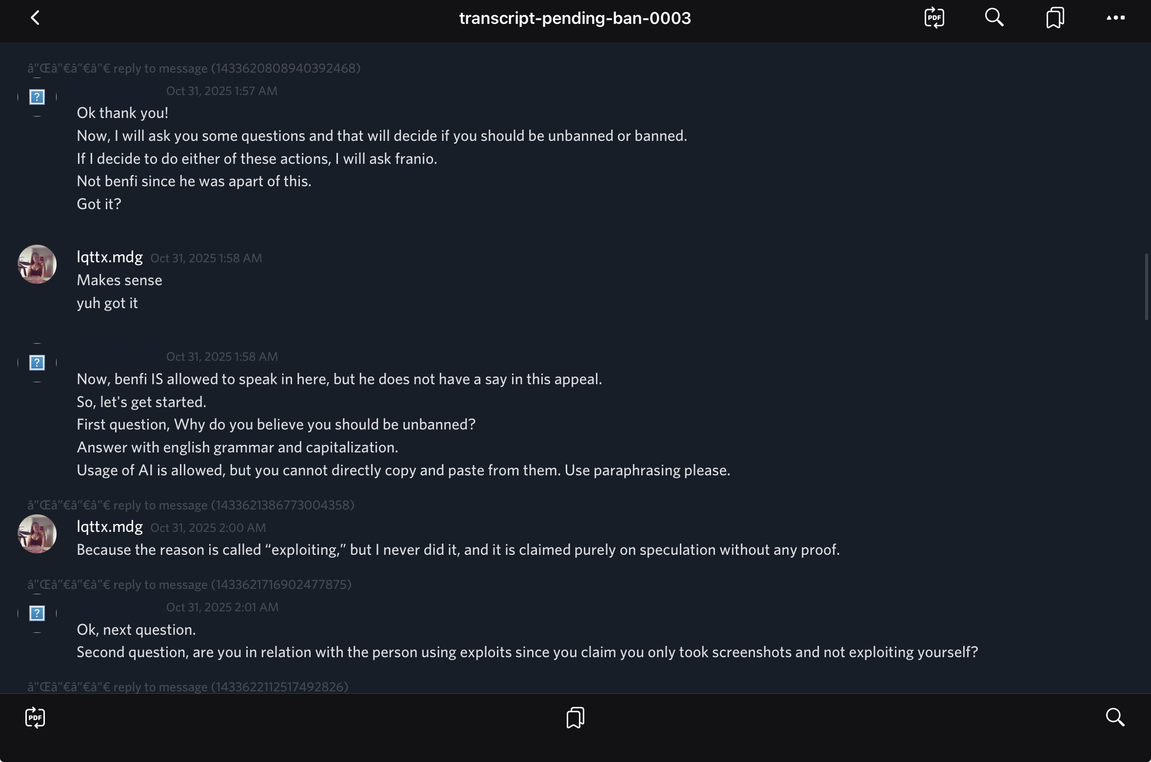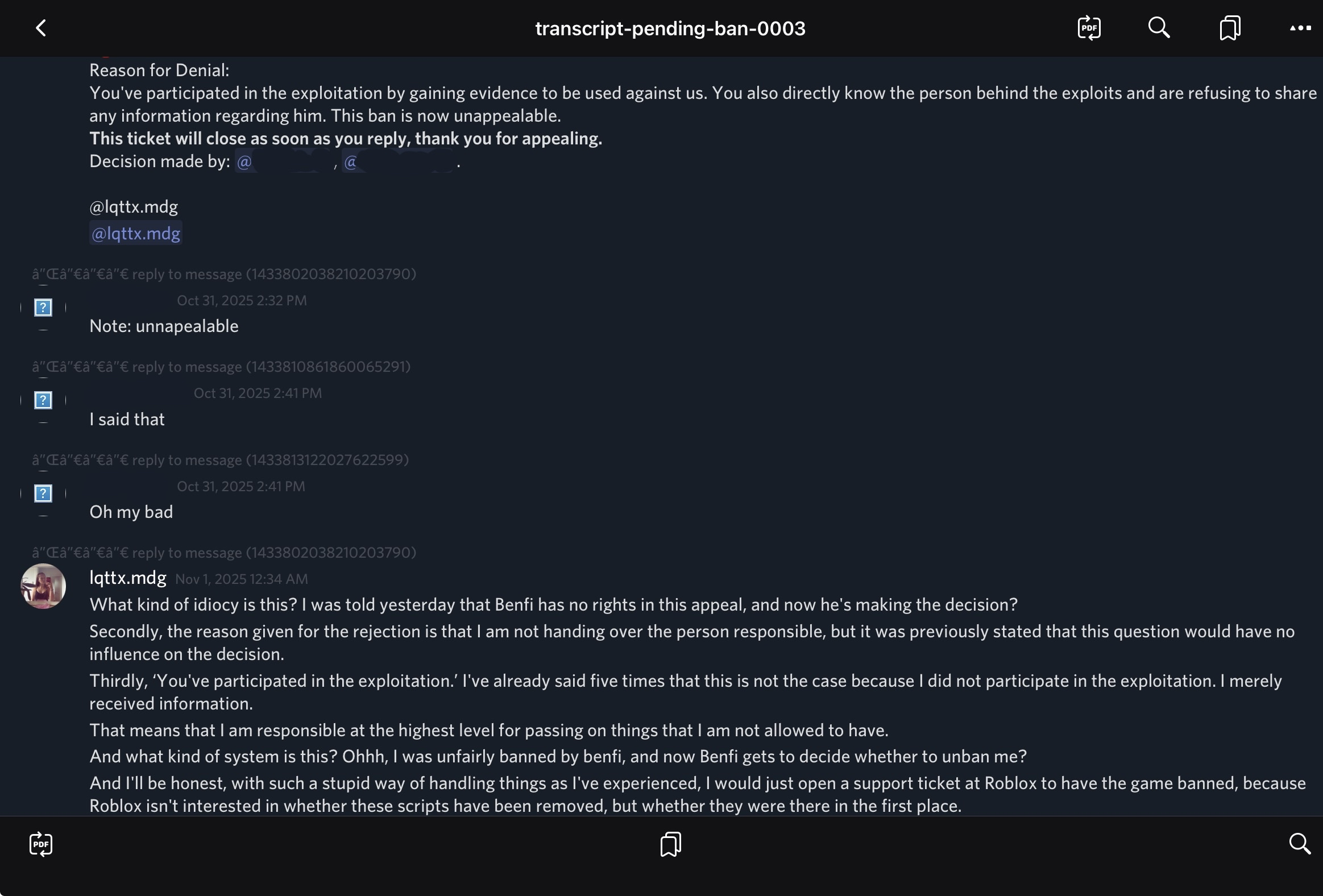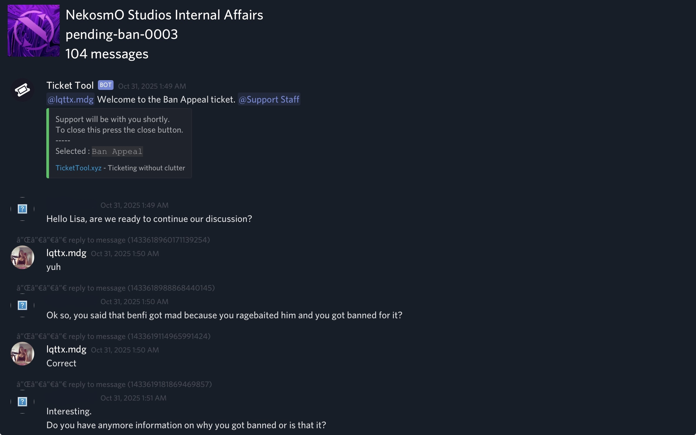 On October 31, 2025, Lisa/Lotta reported that her unban appeal had been handled in an unfair and biased manner. She had been explicitly assured that benfi73zy - the person who originally banned her - would not be involved in reviewing her appeal. However, after approximately half an hour of discussion, benfi73zy made the final decision to deny her appeal and closed the ticket without possibility of further appeal.