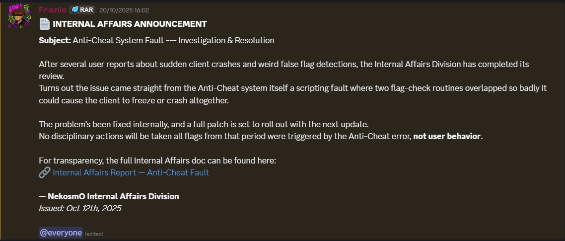 Between September 30 and October 30, 2025, Alexkist (CEO) and Josh Slayer (COO) repeatedly experienced client crashes whenever they attempted to join the NekosmO Corp. Roleplay site. Upon inquiry, Franio (CEO of NekosmO Studios) repeatedly assured them the issue was caused by the game's anti-cheat system and that the team was working to resolve it.